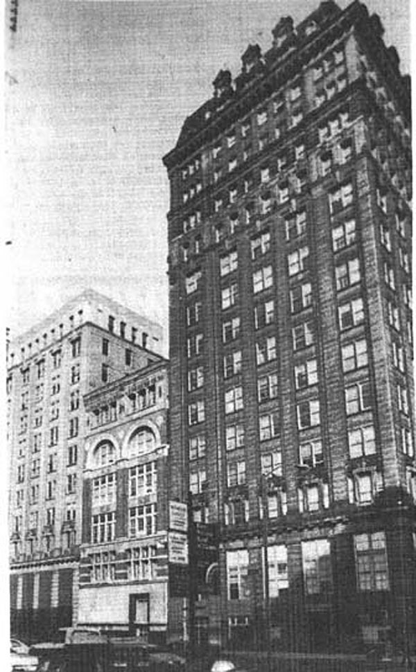 Now the Veterans Administration Building, the building (green roofline trim, left of center) has changed from cream colored to a dull brown gray from sixty years of smoke and soot. Postcard image circa 1970; photograph by Art Grossman.