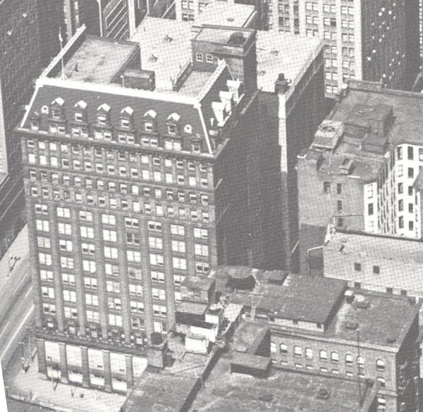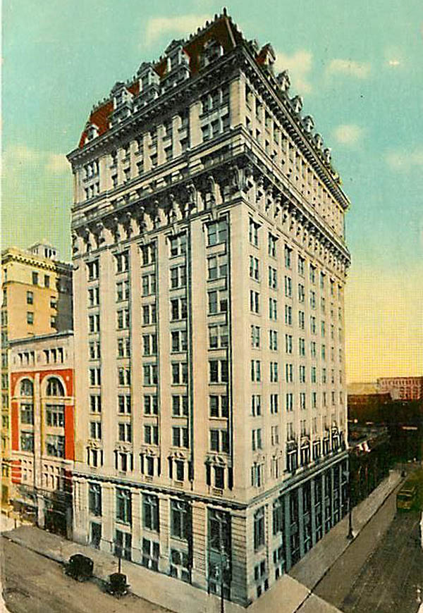 The New National Bank of Commerce Building was a 16-story tower erected under the auspices of the National Bank of Commerce, who had offices in Isaac Taylor's 1901 building at the other end of the block. The new building was concieved as an addition to the bank's existing one, though the presence of the old Post-Dispatch building between the two makes it unclear how they were connected. An unbuilt 5-story addition was also planned in conjunction with the new structure.